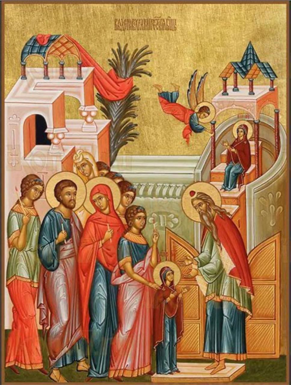 Когда исполнилось Пречистой и Преблагословенной Отроковице, Деве Марии, три года, праведные родители Ее, Иоаким и Анна, вспомнили обещание, сделанное ими в то время, как они молились о разрешении их неплодия, обещание ― принести рожденное от них чадо в дар Богу, и положили исполнить оное на самом деле. Для этого пригласили в Назарет, где они жили, всех своих сродников, которые были Царского и Архиерейского рода, ибо Иоаким происходил от Царского племени, а жена его от Архиерейского. Пригласили также дев чистых, приготовили множество свеч и убрали Деву Марию с великолепием Царским, о чем воспевают древние Св. Отцы Церкви. Св. Иаков, Архиепископ Иерусалимский, от лица Иоакима восклицает: «Пригласите дщерей еврейских чистых, да возьмут свечи зажженные!» Св. Герман, Патриарх Цареградский, от лица Анны говорит: «Приношу Господу обет мой, произнесенный в скорби устами моими, для сего я собрала девиц со свечами, Священников и сродников и говорю им: «Радуйтесь со мною: я перед вами являюсь теперь матерью и дочь мою привожу и отдаю не земному Царю, но Богу Царю небесному"». А Св. Феофилакт, Архиепископ Болгарский, так пишет о царском убранстве Богоотроковицы: «Надобно было, чтоб введение Божественной Отроковицы было Ее достойно: нищенское рубище не может быть прилично такому светлому и многоценному перлу. Надлежало одеть Ее в царскую одежду, чтоб приуготовить к высшей славе и красоте!»