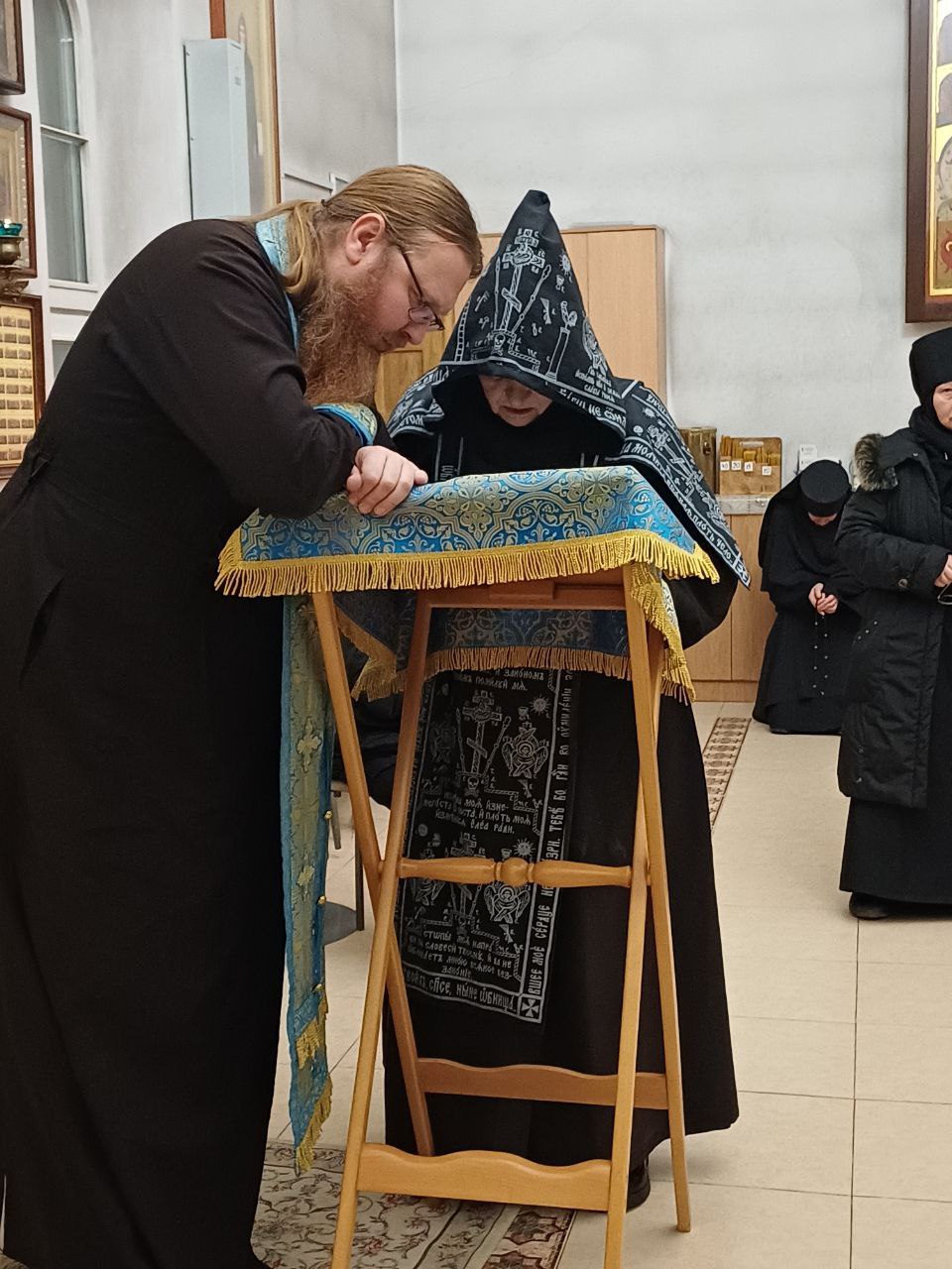 Когда ветхозаветный Кивот вносили в Скинию Господню, перед ним шествовал царствовавший над Израилем Богоотец Давид, а сему одушевленному Кивоту ― Пречистой Деве, вводившейся в церковь Божию, предшествовал не земной Царь, но Царь небесный, к Которому ежедневно молимся: «Царю небесный, Утешителю, Душе истины!» Он сам был водителем сей Дщери Царевой, как свидетельствует о том Святая Церковь в своем гимне: «Во Святая Святых, Святая и непорочная, Святым Духом вводится!» При внесении Кивота было пение, сопровождаемое музыкою, Давид повелел начальникам Левитов поставить певцов, чтобы с песнями мусикийскими на органах, псалтирях, гуслях и кимвалах раздавались гласы веселия, при введении же Пресвятой Девы не от земных мусикийских песен раздавались гласы радости, но сами Ангелы, служа невидимо введению Девы, воспевали Ее. Они небесными своими голосами прославляли Деву, входящую во Святая Святых на службу Господу, как о том воспоминает Церковь: «Благодать совводящи же в Духе Божественном, юже воспевают Ангели Божии: сия есть селение небесное!» . Но здесь слышались и человеческие песнопения, праведная Анна (как говорит Св. Тарасий в своем слове) возглашала к предшествующим девам: «Пойте хвалу Ей, пойте ей на гуслях, славьте Ее песнию духовною, возвеличьте Ее на псалтыре десятиструнном!..» На это указывает и Церковь в сих словах: «Радуются Иоаким и Анна духом, и лики дев поют Господу, псаломски воспевая и Матерь Его чествуя!» Из слов сих видно, что лик предшествующих дев пел Пресвятой Деве некоторые из псалмов Давидовых. Согласно с тем и составитель Канона на Введение говорит девам: «Начинайте, девы, держащие свечи, и воспойте ваши песни!» А сами праведные родители Иоаким и Анна (по свидетельству Св. Тарасия) пели песнь праотца их Давида: «Слыши, дщи, и виждь, и приклони ухо твое, и забуди люди твоя, и дом отца твоего: и возжелает Царь доброты твоея...» (Пс.44:11–12). Феофилакт повествует, что Священники, служившие в церкви, вышли и встретили с песнями Богоотроковицу, предопределенную быть Материю Архиерея великого, прошедшего небеса. Праведная Анна (как пишет Св. Тарасий) так говорила Дочери своей при Ее входе в церковь: «Гряди, Дщерь моя, к Тому, Кто Тебя даровал мне! Гряди, кивот освящения, к многомилостивому Владыке; гряди, дверь жизни, к милосердому благ Подателю; гряди, ковчег Слова, во храм Господень; вниди в церковь Господню, радость и веселие мира!» Потом, вместе с Иоакимом, обратясь к Захарии, как Пророку, Святителю и сроднику своему, Анна сказала: «Прими, Захария, сень чистую; прими, Священник, ковчег непорочный; прими, Пророк, кадильницу, не с вещественным углем: прими, Праведник, фимиам духовный». А Св. Герман повествует, что она так говорила Архиерею: «Прими, Пророк, Дщерь, Богом мне дарованную, прими, введи и всели Ее на гору Святую, в готовом жилище Божием, не испытывая о Ней, но ожидая, что Богу, Ее призвавшему, благоугодно будет совершить с Нею».